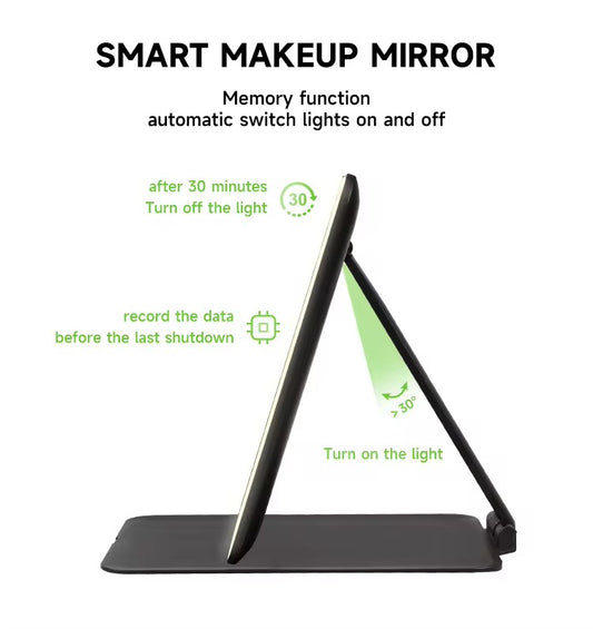 INNOVATIVE Travel Makeup Mirror with Light, Portable Folding Make Up Tabletop Mirror with 58 LEDs 3 Colors Light Modes Rechargable Compact Vanity Mirror with Adjustable Stand -1500mah