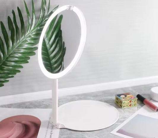 INNOVATIVE Round Portable Travel Makeup Mirror with Light, Portable Folding Make Up Tabletop Mirror with 58 LEDs 3 Colors Light Modes Rechargable Compact Vanity Mirror with Adjustable Stand -1500mah