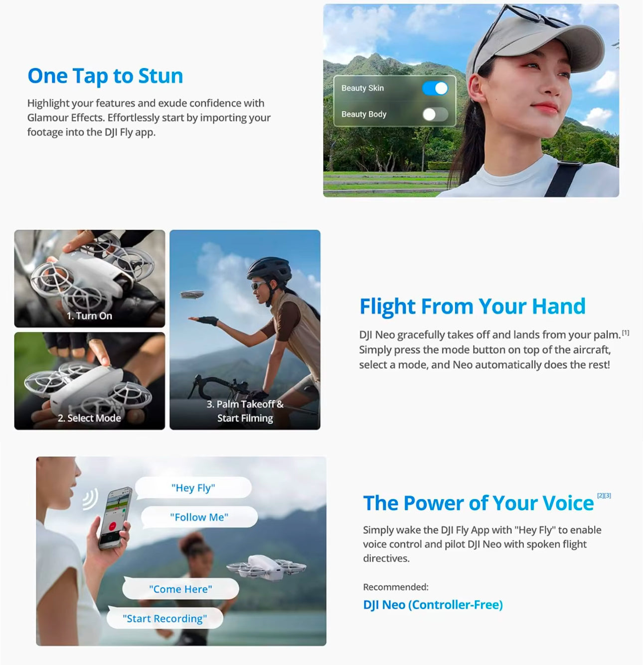 - Palm Takeoff & Landing, Go Controller-Free [1] - Neo takes off from your hand with just a push of a button. Neo's safe and easy operation makes it perfect for taking to family BBQs and hiking with friends.