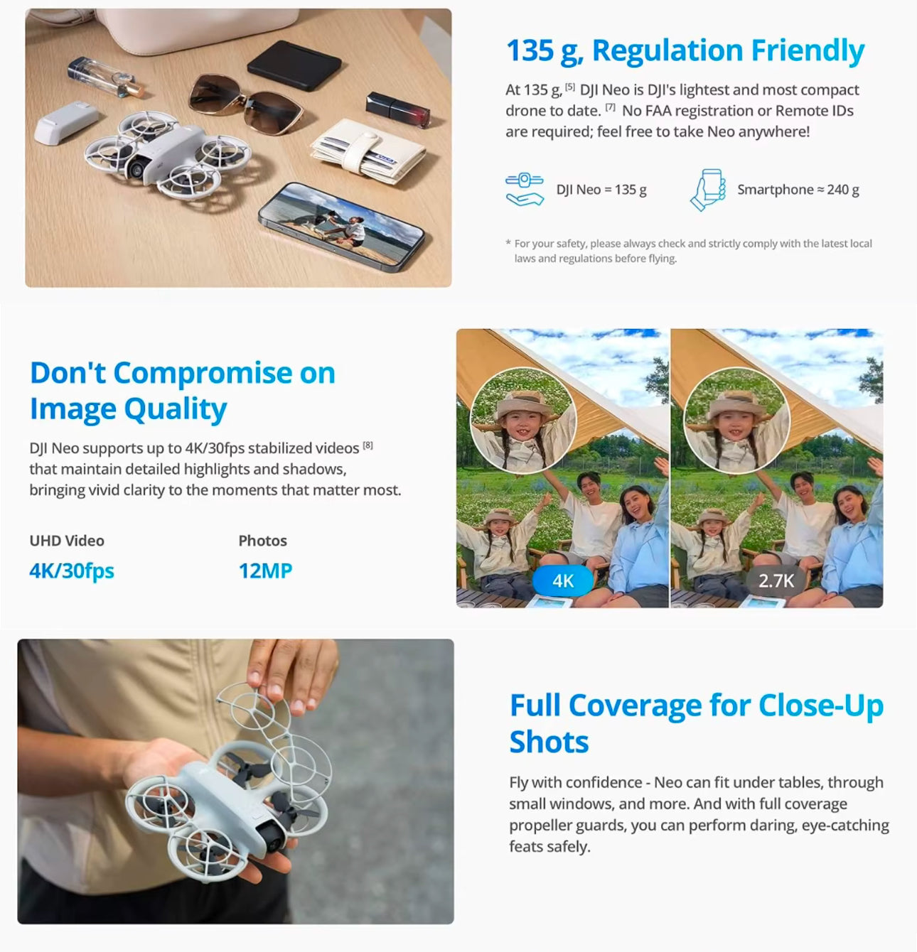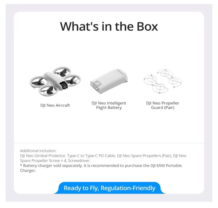 - Lightweight and Regulation Friendly - At just 135g, DJI Neo may be even lighter than your phone and does not require FAA registration and Remote ID. Throw Neo in your backpack or even your pocket. Just grab and go!