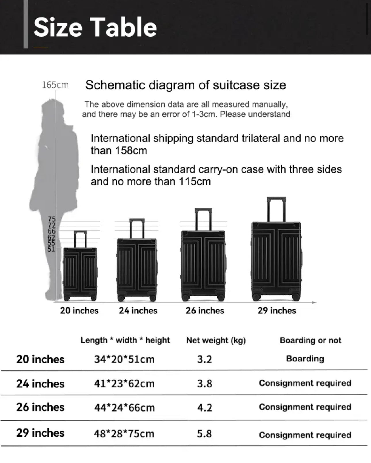 Expertly crafted with ISP anodised aluminium alloy and riveted high-gloss aluminium corners, the large 4 wheel aluminium suitcase provides ample space for all your travel essentials. With lightweight yet durable construction, this suitcase is perfect for all your travel needs.
